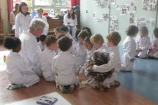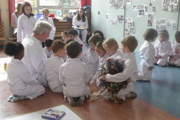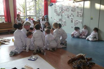 Als de kinderen hun overall hebben aangedaan en langs de kant zitten, wordt er klassikaal gekeken wat er de vorige keer is gemaakt. De 'producten' die de vorige keer zijn ontstaan laat meester Wolf zien. Wanneer hij iets in de lucht houdt, wat bestaat uit verschillende draadjes wol en plakband, die losjes samenhangen en vraagt wat het is roepen kinderen: 'niks', een 'bal' en 'pruts'. Uiteindelijk wordt het benoemd tot 'Pruts'.