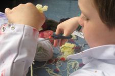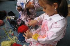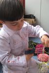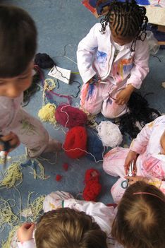 Efecan, Willem, Felicia en Melisa knippen bolletjes wol in hele kleine stukjes. Ze maken 'vuurwerk'.