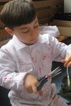 Efecan ontdekt dat je niet alleen met 1, maar ook met 2 en later zelfs met 3 scharen tegelijk kunt knippen. Meer dan 3 scharen passen niet rond zijn vingers.