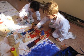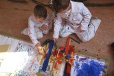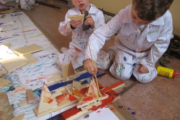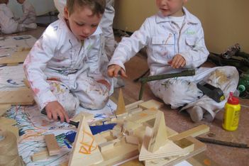 Sana, Armin en Willem werken samen aan een groot bouwwerk. Het bestaat uit allemaal stukjes hout die aan elkaar worden gelijmd.