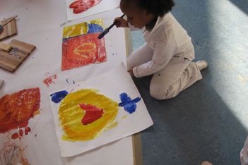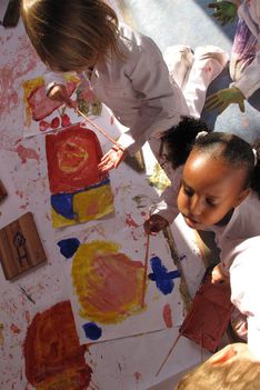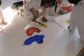 Ifraah en Iris hebben groen gemaakt. Ze zijn er trots op. Hoe hebben jullie het gemaakt? Nou, we hebben geweoon blauw en toen er geel bij gedaan en toen was het groen. Ze gaan samen elkaars schilderij afmaken.