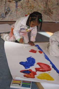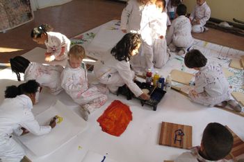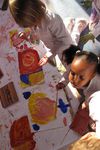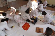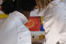 Verschillende groepjes meiden zitten te schilderen.