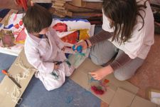 Rutger heeft de schaar en de wol weer gevonden, hij plakt stukjes wol op een karton. Voor hij begint test hij alle scharen.