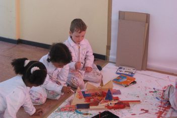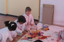 Willem, Armin en Sana gaan verder met het werken aan hun kunstwerk. Ze schilderen het.