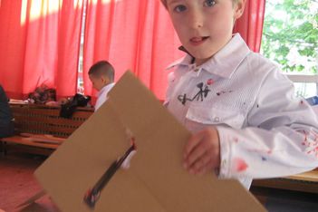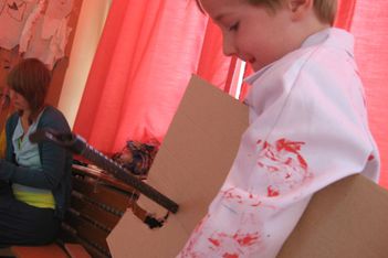Wanneer hij klaar is met zijn rasp en karton, gaat hij Mare helpen met haar bouwwerk, wat een speeltuin wordt.