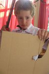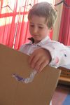 Casper heeft een ronde rasp. Hij raspt ermee in een stuk karton, terwijl hij rondloopt.