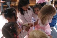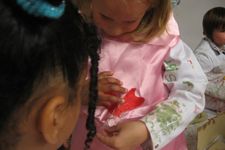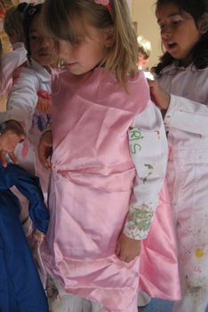 Vandaag zijn er nieuwe lappen stof in het atelier. De dames die normaal graag tekenen zitten nu in de roze stof te knippen.Ze knippen er kleine stukjes vanaf. Felicia heeft een gat geknipt in een grote lap. Ze hangt hem als een jurkje om haar nek. Ze staat er mooi mee in het rond te draaien. Iris wil ook een jurkje net als Felicia. Ze heeft al een lap stof en knipt er in, maar dat maakt het nog niet tot een jurk. Ze wil een gat voor haar arm. Ze begint vanaf de zijkant te knippen en wil er zo een rondje uit halen. Maar zo ontstaat er geen gat, want vanaf het gat is er ook een knip gemaakt naar de rand. Uiteindelijk lukt het toch om twee gaten te maken voor haar armen. Ashanty helpt Iris haar jurk aan de achterkant dichtmaken, met plakband. Later tekent Iris een hartje op papier. Ze kleurt het rood en knipt het uit. Met plakband plakt ze het midden op haar jurkje. Later helpt Iris Ashanty met het maken van een rokje. Een lap roze stof wordt om de heupen van Ashanty geplakt door Iris. Bij het maken van de jurkjes hebben de meiden heel wat bekijks. Shahie, Ceyda en anderen zijn heel benieuwd hoe de kleding wordt gemaakt.