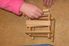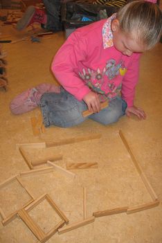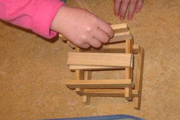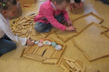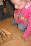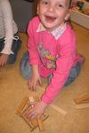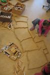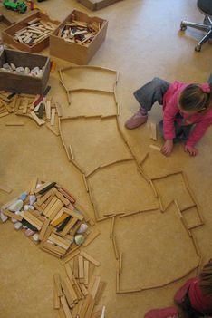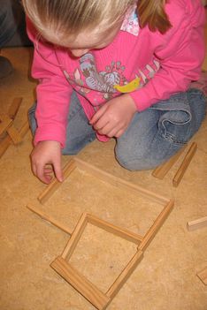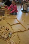 Ze begint te bouwen. eerst een toren. Die valt. Ze probeert het nog eens. Dan valt de toren weer. Ze gaat verder in het platte vlak. Anders dan de meisjes naast haar is ze zonder plan aan het werk. 'Ik ben gewoon leuk aan het bouwen', vertelt ze. Ze is meer dan een half uur bezig. Haar bouwwerk wordt groter en groter. Pas als de hele klas stopt met werken, stopt zij er ook mee.