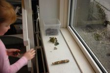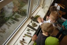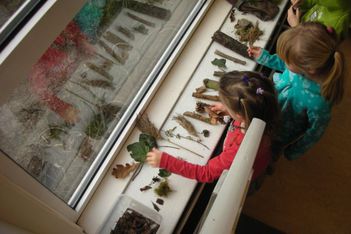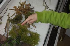 Alle spullen uit het bos lagen op de tafel. Saskia had de tafel nodig in de klas. Irma vertelde gisteren dat ze de spullen best konden tentoonstellen in de vensterbank. Toen ik dit met de kinderen besprak, hoefde ik niks meer te doen. Iedereen stond op en samen verplaatsten ze alle bosspullen naar de vensterbank en zij legden het op hun eigen manier neer...