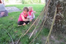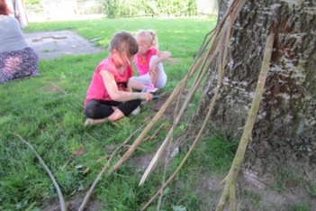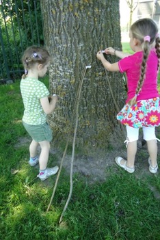 De stokken voor het boomhuis bleven niet vanzelf staan. De kinderen bedachten oplossingen en hypotheses waarom dit niet werkte. De stokken werden multifuncioneel gebruikt als bouwmateriaal of als kwast.