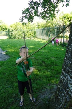 Tim: De stokken zijn te kort. Ik heb een schep nodig om een gat te graven. Daar doe ik de stok in zodat hij groot wordt.