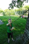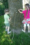 Lotte is met een tak met blaadjes de boom aan het vegen. Als we vragen wat ze doet zegt ze: Ik verf het huis.