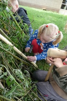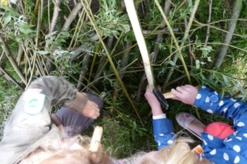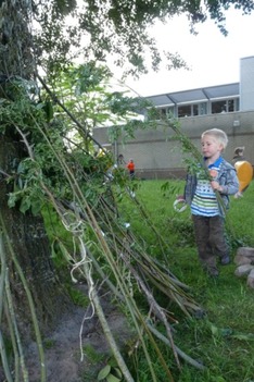 Rico haalt takken, en ik ga bouwen, zegt Rico, samen met Jip. Mooi dicht maken zodat er geen regen in komt.