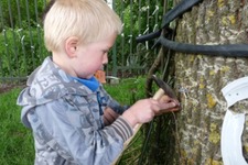 Danaï legt blaadjes in de hut en zegt: dan kunnen ze het eraf happen, de blaadjes.