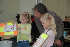 Met gebruik van stickers, die in grote getale aanwezig zijn in de school, worden materialen verbonden, composities gemaakt, maar ook een schilderij zoals dit. Dylan die het gemaakt heeft zegt: 'Het stelt dit atelier voor met de kunstenaar Harold die allemaal rotzooi maakt!'.