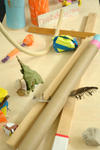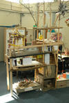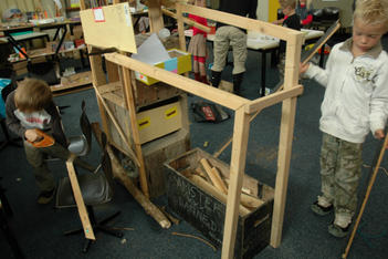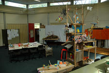 De kast met werkjes erin en een verzameling 'vogels' in de bomen