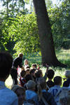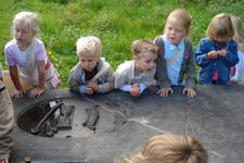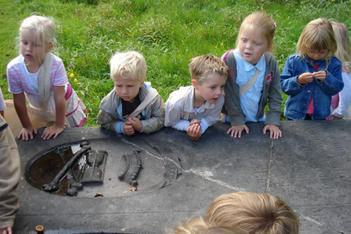 Al snel viel het oog op de kerk, met daar bovenop een haantje. De kinderen keken hier aandachtig naar; het leek wel goud zo in de zon. Ook heeft Dennis van de begraafplaats nog een verhaal verteld over een piraat die daar begraven ligt.