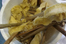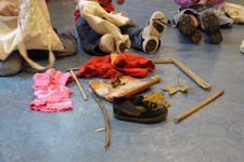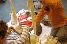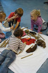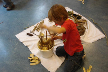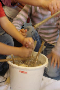 Later kwam de emmer lijm in het spel. Daarin werden stroken stof geprakt, door er met stokken in te duwen. Anders kreeg je vieze handen. In het begin werkte iedereen mee, later was Mihailo als enige met de stok in de lijm aan het prikken. De nieuwelingen kozen voor een eigen werktafeltje, en plakten stukjes stof op papier. Antoine maakte linten aan stokjes, en zwaaide daarmee rond. Sem maakte een compositie van kastanjes, hazelnoten, en kurk.
