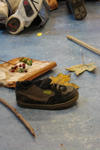 De sfeer was wat afwachtend, wij daardoor ook. Toch ontstond er iets. Er werd een blaadje neergelegd. En een stuk dakpan. En Sem zijn oude schoen. Later kwam er nog een t-shirt erbij, met een oog erop. En een mond. Maar geen oor. Om de beurt legden ze er wat bij uit het atelier. Er werden stokjes gepakt. Mihailo merkte op, dat het op een huis leek.