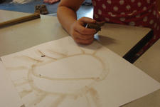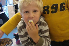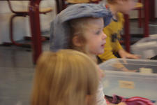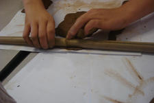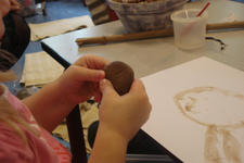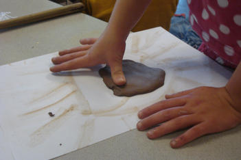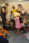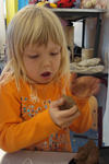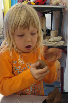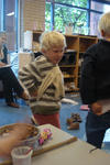 Na het inrichten van de stellage met hun kleertjes gingen een aantal kinderen kleien en tekenen met klei. Allison maakte een molen met een zon er in. Loes had ene slang gemaakt, met een babyslang en twee huisjes.