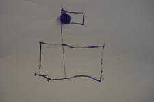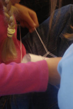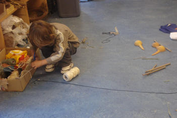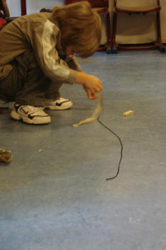 Hierna gingen de kinderen verder met beeldend werk. Een gedeelte van de groten tekende zeemeerminnen. Michaelo trok lijnen over de vloer met draden.