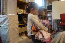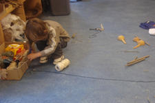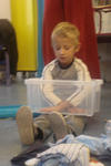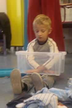 Vandaag gingen de kratjes met hun oude kleertjes mee naar het atelier. De kinderen mochten hun kleertjes uit de kratten halen. Van tevoren was er een stelling gebouwd van tafels, banken en stoelen, waar zij hun spulletjes in mochten doen. Er werd nagedacht over zachte en harde spullen en kleur.