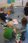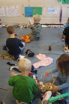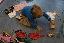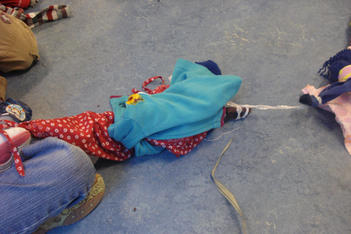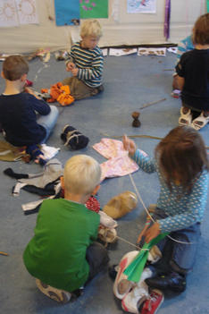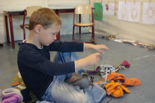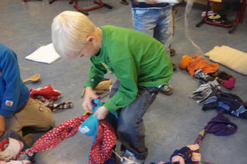 Ze vonden het leuk om nieuwe kleertjes aan het werk toe te voegen. Hee, het wordt een reuzenketting, riep Bente. Dus het werd een reuzenketting, voor een reus van wel 6 meter! Later was alleen Anton nog bezig aan de reuzenketting samen met Jeroen. De rest van de kinderen had een eigen spel gevonden .Zoe en Mihalo voerden een telefoongesprek. Terwijl Mihalo haar met repen band behing. Andere kinderen maakten cadeautjes.