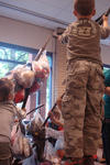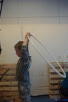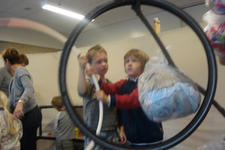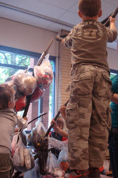 Dit was een grote verrassing. Anton had meteen een oplossing. Als er meer aan de andere kant zou hangen, zou de boom in evenwicht blijven. De mannen pakten het meteen aan, en sjorden de boom weer rechtop. Er moesten nog meer appels (zakken met kleding) aan om de boom rechtop te houden. Iedereen werkte eraan mee.