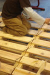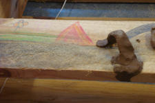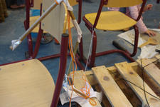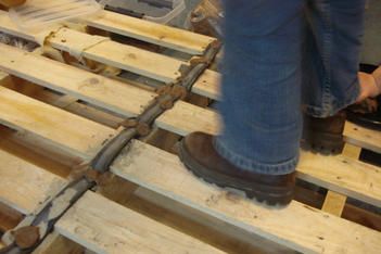 Anton en Antoine zorgden ervoor dat de twee palets aan elkaar vast kwamen. Dit gebeurde met veel klei, lijm en stukken binnenband.