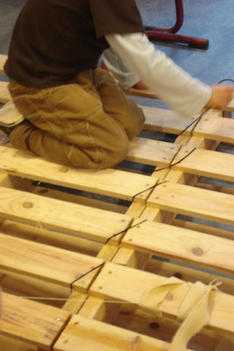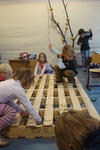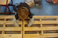 Deze groep koos er ook voor om boten te gaan maken. Hier verliep het echter heel anders. Er lagen houten palets op de grond. Deze werden al snel omgetoverd tot een grote boot. Samen werkten ze aan de boot.