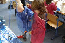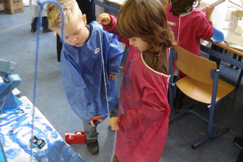 Jango vindt een bol met lichtblauwe wol op het blauwe vel. Hij rolt er een klein stukje van af: 'zo groot moet hij zijn'. Daniel gaat een schaar halen. Ondertussen past Jango steeds met zijn handen een stuk af, kijkt een beetje dromerig voor zich uit en doet zijn handen dan verder of minder ver uit elkaar. Als Daniel terug komt weet hij het: 'hier moet je knippen'. Daniel probeert te knippen maar het lukt niet. Ik help ze en dan gaat Daniel weer zitten kijken op zijn stoel hoe Jango het draadje met lijm vast maakt.