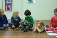 Wanneer de viool bij Petra is, vraagt Emma aan de kinderen met welk lied we deze sessie zullen afsluiten. De kinderen antwoorden in koor: Het lied voor de maan (Chant to the moon). Samen met Els, de gekozen instrumenten, gemaakte dansen en melodieën! Omdat het over de maan gaat doen we de lichten uit. We spelen in het donker. Door het raam valt een streep licht. Het lijkt wel maanlicht!