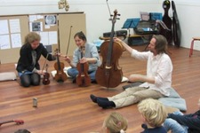 Vandaag ontvingen wij weer bezoek! Inki (op viool) Els, op altviool die eerder al bij ons was, vandaag op altviool en Michiel op cello. Met de eindpresentatie in het vooruitzicht zullen wij de kinderen vandaag uitnodigen om bij de liederen, van Silke en Veerle, een begeleiding te maken.