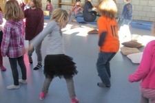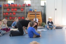 Dan gaan worden de groepjes verdeeld: de helft van de kinderen begint met instrumenten, de andere helft gaat in de kring elkaar spiegelen. Na een tijdje wordt gewisseld.