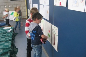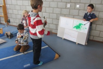 We zien deze groep samenwerken, vooral met het medium dirigeren en het verklanken van tekeningen. Soms vragen we ons af of ze echt gemeenschappelijk met iets bezig zijn, vooral Luka zit er vaak dromerig bij. Rens en Senna gaan ook in hun eentje “op pad” tijdens het vrije werken. José vroeg aan Luka “weet je nou wat je moet spelen?” Waar op Luka antwoordde: “ja, bij die rondjes moet ik tikken en dan komen we bij mijn tekening, en dan gaan we in het gras dweilen, en dan gaat het regenen.” Heel mooi om te horen dat het zo helder voor hem is.