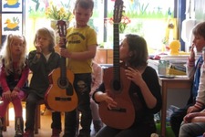 Felix heeft van zijn opa en oma een prachtige gitaar gekregen. Hij heeft hem meegenomen en speelt in de klas voor. Bij het goededag lied speelt hij mee. Dan gaan we vrij werken. Juf Hans neemt de groepjes die zij begeleid mee naar de gymzaal. Debby gaat met haar groepjes naar het lerarenlokaal.