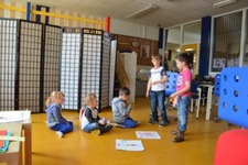 We beginnen gezamenlijk in de klas met het namenliedje en een kort gesprek. Dan nemen juf Hans en juf Debby ieder een groepje mee naar een ander lokaal. We wisselen 3 keer van groepje.