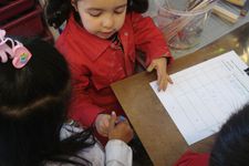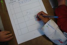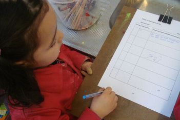 Oumaima nam als eerste het initiatief om op het vel papier te gaan schrijven.
