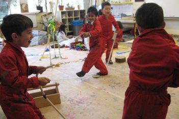 Server, Aryan, Nassim en Younes hadden gele wol door het atelier heen gespannen. Tijdens het spannen van wol werden er ook voeten en benen van anderen ingewikkeld.