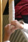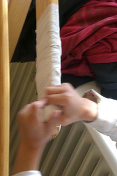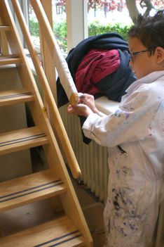 Akram wikkelde heel netjes de uiteinde van de trapleuning in met wit plakband.