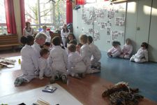 Als de kinderen hun overall hebben aangedaan en langs de kant zitten, wordt er klassikaal gekeken wat er de vorige keer is gemaakt. De 'producten' die de vorige keer zijn ontstaan laat meester Wolf zien. Wanneer hij iets in de lucht houdt, wat bestaat uit verschillende draadjes wol en plakband, die losjes samenhangen en vraagt wat het is roepen kinderen: 'niks', een 'bal' en 'pruts'. Uiteindelijk wordt het benoemd tot 'Pruts'.