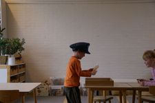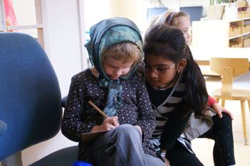 We zitten te werken. Romy begrijpt nog niet wat ze precies op de kaart moet zetten. Waar moet de naam? Wat moet er op de postzegel staan? Ze denkt dat de naam op de postzegel moet. Als Merijn langsloopt met een heel klein papiertje voor een postzegel, zegt ze: "/m/u/r/ij/n/, huh, al die letters, dat past nooit op dat briefie!"