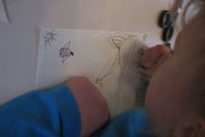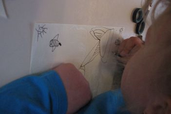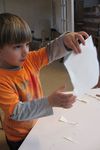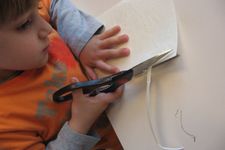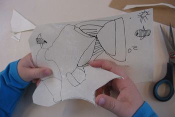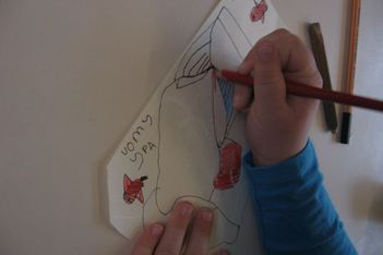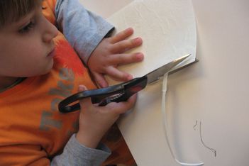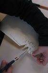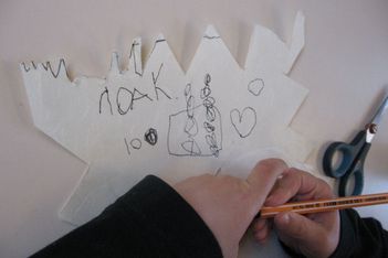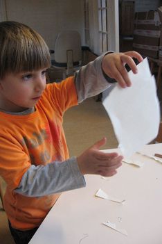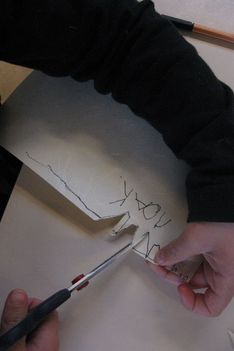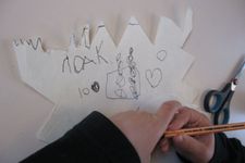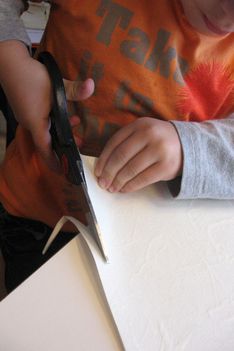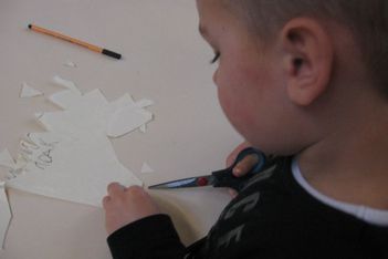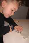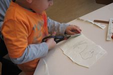 Jori knipt ingespannen de "stekels" aan zijn postzegel. Op een gegeven moment is hij wel erg uitgeschoten. Geschrokken kijkt hij naar juf. Samen komen ze er achter dat zijn zelfgeschreven woord er tenminste niet af is geknipt. Gelukkig!