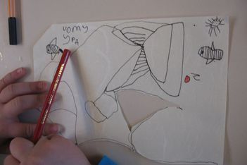 De kinderen gaan aan het werk. Ze krijgen bijzonder mooi papier. Op het formaat van een half A4 vel maken ze met een fineliner een reuzengrote postzegel. Het inkleuren doen ze met kleurpotlood.