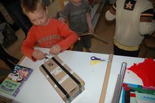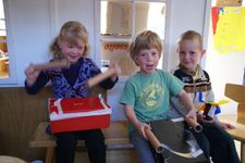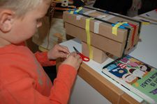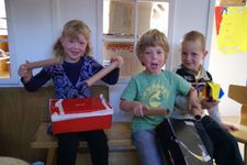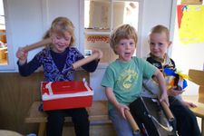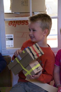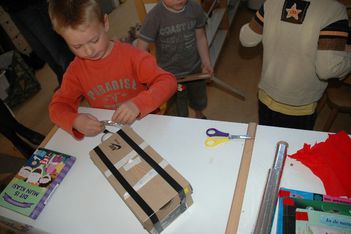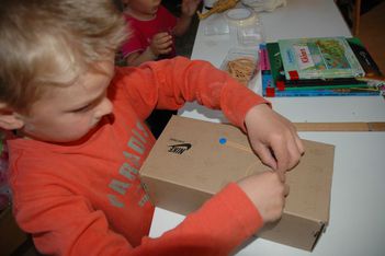 Vandaag lag onze focus bij het maken van geluidinstrumenten.De kinderen mochten net als gisteren geluiden gaan zoeken die ze zelf konden maken, alleen van materialen die ze mee naar huis zouden mogen nemen.De kinderen gingen in het atelier op zoek naar materialen. Ze vonden dozen en potjes waar ze materialen in konden doen, zoals gedroogde bonen waarmee ze dan geluid konden maken. Mick ging een gitaar maken, dus die had een doos nodig net als Coen. Die maakte van karton en elastiekjes een instrument. Mick was heel lang bezig met het aan elkaar plakken van de 2 kartonnen.Er werden trommels gemaakt en de meeste van de geluidinstrumenten werden heel mooi versierd. Soms werd er op een instrument nog een instrument gemaakt met elastiekjes of nog een doosje. Toen de meeste kinderen klaar waren mochten ze in de kring komen en geluiden gaan maken, samen met Irma die op de djembe sloeg.Merijn kan niet goed kiezen wat hij wil maken. Iedereen is al druk bezig. Hij kijkt en kijkt. Dan ziet hij van Romy hoe zij een trommel maakt: een doos met een touwtje eraan. 2 rollen erbij als stokken. Goed plan! Merijn doet er nog een schepje bovenop: hij doet ook nog bonen in de schoenendoos. Prikt twee gaten in de zijkant om er een katoenen draadje door te doen. Ondertussen zit de rest van de groep in de kring met Irma muziek te maken. Juf ziet de drang bij Merijn om het af te maken. En het liefst snel. Als het uiteindelijk gelukt is met het draadje (het draadje moet door de gaten en door de doos heen) hangt hij zijn trommel om zijn nek. En het draadje breekt. Wat een teleurstelling als hij naar zijn trommel kijkt die op de grond ligt... Snel helpt juf om het weer goed te krijgen en kan hij nog net het laatste stukje meedoen. Glunderend zit hij in de kring te trommelen!De kinderen waren zeer enthousiast en ze wilden bewegen bij al deze geluiden. Daarom besloten we om naar buiten te gaan met de instrumenten en daar geluid te maken. Eerst gingen de kinderen rustig zitten in de cirkel maar als snel gingen ze er bij bewegen en rennen. Na de pauze hebben we nog in de klas geluiden gemaakt met je mond, je handen, je voeten. Er kwamen prachtige geluiden voorbij van allerlei dieren maar ook geluiden die bij niets horen.Wesly heeft een heel bijzonder instrument gemaakt dat de klas nog niet heeft gehoord. Het is een water instrument in de vorm van een toren. Donderdag gaan we er naar luisteren.