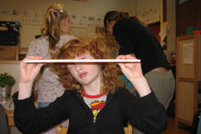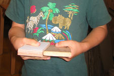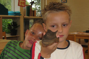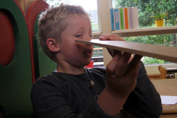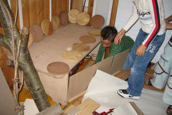 In de opruimruimte! (...een verzameling onder een tafel. De jongens hebben er planken voor gezet als deurtjes). Welke kenmerken van het hout zie je als je goed kijkt?