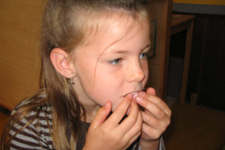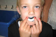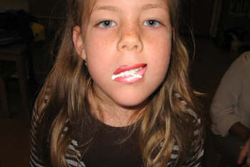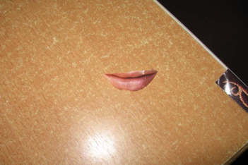 Later op de ochtend vinden we in een kunstboek een plaatje met allemaal lippen. Die zijn allemaal rood! Iedereen pakt een tijdschrift uit het atelier en gaat lippen zoeken. Tobias of Madelon vindt uit dat je de papieren lippen op je eigen lippen kan plakken als die een beetje nat zijn. Ze experimenteren met verschillende soorten lippen, kijken steeds in de spiegel hoe het eruit ziet en laten Liesbeth een foto maken. Dalya, Sanne en Annemarie proberen het ook.