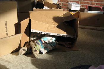 de kinderen zijn nieuwsgierig en nemen eigenlijk onmiddelijk het hele atelier in beslag. Overal zijn kinderen bezig. De dozen zijn ideale onderzoeks- en schuilplekken.