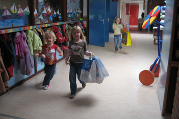 Een klein groepje meisjes onderzoekt al boodschappend de gang naast het atelier.