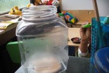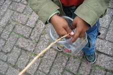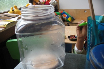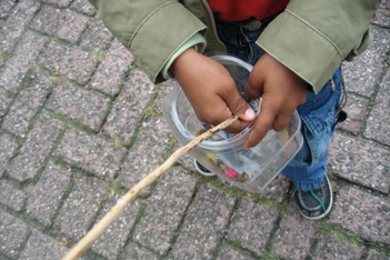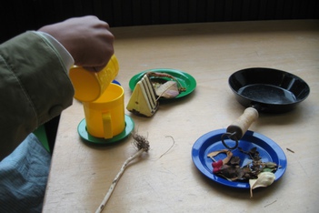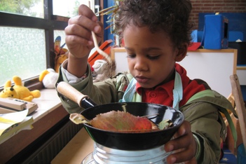 Tijdens onze speurtocht naar nieuw materiaal in het parkje achter de school is Eyram aanvankelijk vooral door een propellertje gefascineerd (die had ik hem laten zien). Hij is zeer betrokken. Maar in tegenstelling tot Omar (zie Omars huiskamer) gebruikt hij zijn verzameling om er over te fantaseren en om verhalen te vertellen. Terwijl hij dit doet roert (kookt) hij alsmaar in zijn verzamelbak. Dit roeren fascineert me. Terug op school gaat hij niet met de rest van de groep naar buiten maar gaat naar het keukentje in het klaslokaal en kookt. De beweging van het roeren is zeer belangrijk. Wat verder opvalt is de stapeling met de pannen. Het verzamelpotje (doorzichtig) is altijd het onderste potje. De andere pannen worden er bovenop gestapeld. Mij is onduidelijk waar hij het over heeft. Hij speelt intensief en reageert nauwelijks op mijn en Inge's vragen. Hij spreekt nauwelijks Nederlands, volgens mij is dat de reden. Hij vindt het spannend dat wij naar hem kijken, foto's maken en Inge hem filmt.